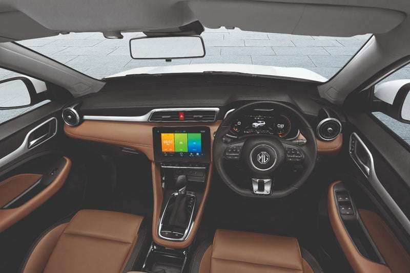 Nuansa interior new MG ZS semakin berkelas dan segar dengan balutan two-tone soft touch leather berkombinasi warna coklat-hitam pada dashboard, new front arm rest/konsol tengah, dan jok. Pada sisi tengah dashboard bertengger layar jauh lebih besar, 10.1” infotainment system yang memiliki kemampuan screen mirroring smartphone untuk memberikan hiburan dan mengakomodir pengendara agar tetap terhubung dengan dunia luar saat berkendara. Sehingga aktivitas menyetir tetap fokus, aman, dan nyaman. Tombol kontrol di bawahnya pun turut mengalami pembaruan dan kini terlihat lebih berkelas dengan desain piano button.