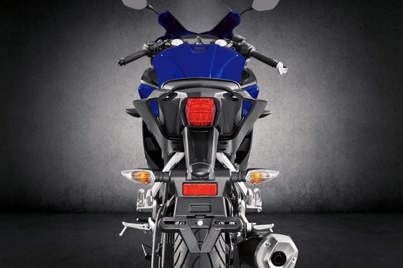 Desain Yamaha R125 2019 dari depan, samping hingga belakang, termasuk tangki bensin lebih radikal dibandingkan sebelumnya. Di depan terpampang sepasang headlight kembar LED yang garang.